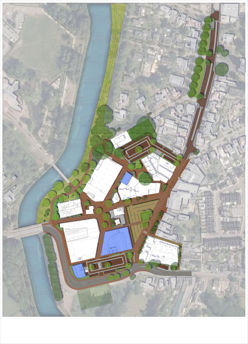 De blauw gekleurde gebouwen zijn nog in ontwikkeling. Het gaat om het Kloosterpadblok, de Raadskamer en de Groene Villa.