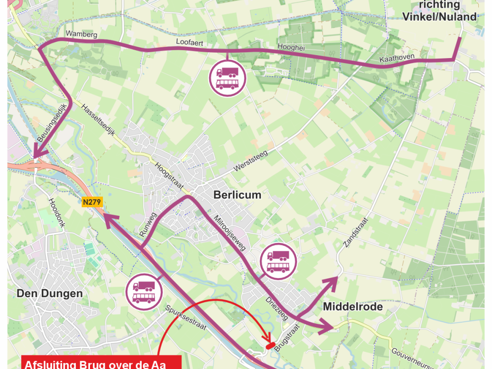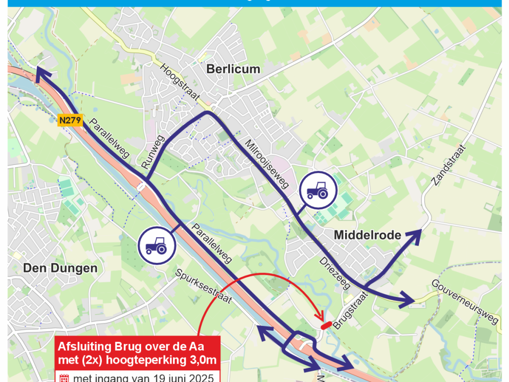 De brug over de Aa in de Brugstraat/Kapelstraat in Middelrode is tijdelijk afgesloten voor zwaar gemotoriseerd verkeer. De brug is niet stevig genoeg meer voor zwaar verkeer en er wordt gewerkt aan vervanging. Dat betekent dat landbouwverkeer, vracht- en busverkeer vanaf 19 juni 2025 tijdelijk niet over de brug mogen rijden. Het overige verkeer kan de brug blijven gebruiken.
