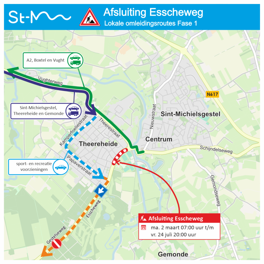 - Om sluipverkeer vanaf de A2 in Theereheide tegen te gaan, wordt in fase 1 de Gestelseweg vanaf de A2 (afrit 25) tijdelijk ingesteld als eenrichtingsverkeer. De rijrichting die wordt afgesloten is vanaf de A2/Boxtel richting Sint-Michielsgestel. Hierdoor is Sint-Michielsgestel vanuit de A2 (Eindhoven) bereikbaar via afrit 25 ‘Vught’.