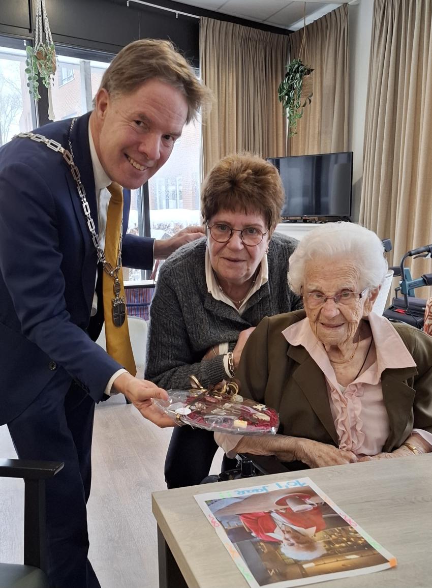 Op de foto van links naar rechts: burgemeester Eiko Smid, trotse dochter van mevrouw Smulders-van der Aa en mevrouw Smulders-van der Aa.