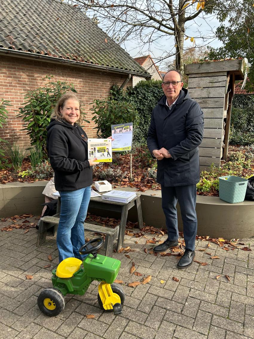 Foto: Wethouder Theo Geldens reikt verkeerskeurmerk Groen Licht! uit aan kinderopvang De Teigetjes in Den Dungen.