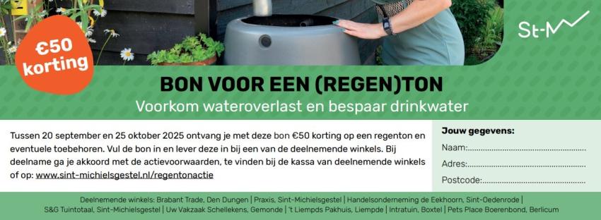 Van 20 september tot en met 25 oktober 2025 krijg je met de kortingsbon van de gemeente van € 50,- korting op een nieuwe regenton. De bon kun je hieronder opslaan en daarna uitprinten. Klik daarvoor met je rechtermuisknop op de afbeelding van de kortingsbon, kies voor afbeelding opslaan als en daarna kun je de bon uitprinten vanaf je computer. Je kunt de afbeelding ook direct afdrukken via je mobiele telefoon.
